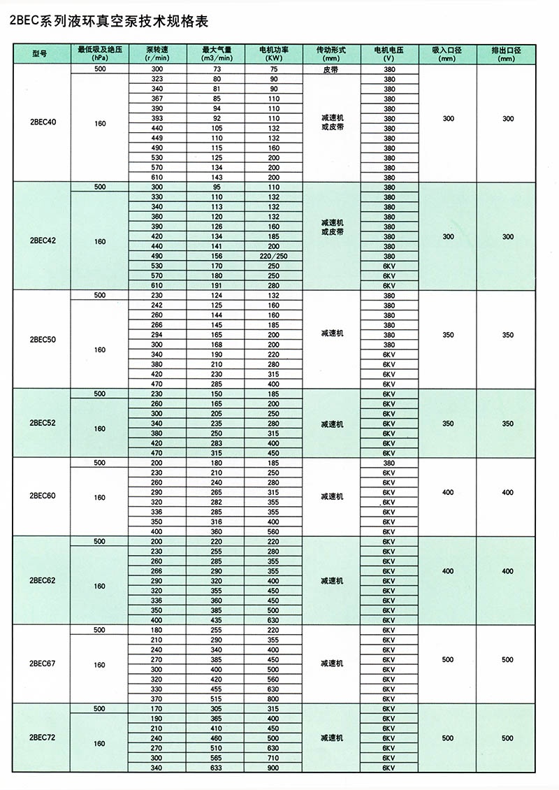 2BEC系列水环真空泵(瓦斯抽放泵),是我公司在多年科研成果和生产经验的基础上,结合国际同类产品先进技术,研制开发的高效节能产品,通常用于抽吸不含固体颗粒,不溶于水,无腐蚀性的气体,以便在密闭容器中形成真空和压力。通过改变结构材料,亦可用于抽吸腐蚀气体或以腐蚀液体做工作液。广泛用于造纸、化工、石化、轻工、制药、食品、建材、电器、洗煤、选矿、化肥等行业。在煤炭行业尤其可抽放高度易燃易爆气体,如瓦斯、甲烷,可设计安装地面瓦斯抽放站,可配套移动瓦斯抽放系统。