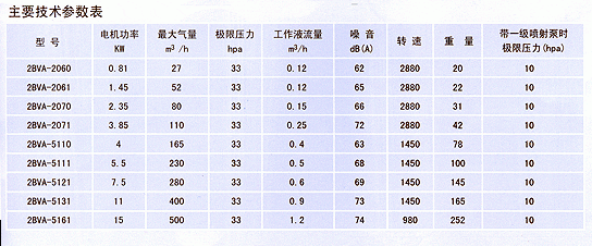 2BVA系列真空泵适于抽除气体和水蒸汽,吸气压力可以达到33mbar决压(97%真空度)当真空泵气压力低于80mbar的状态下长期工作时,应联接气蚀保护管以对泵进行保护,如配大气喷射器,吸气压力可达到10mbar。喷射器的可直接安装在真空泵上。作为压缩机用时,其压力zui大至0.26mbar(绝压)。